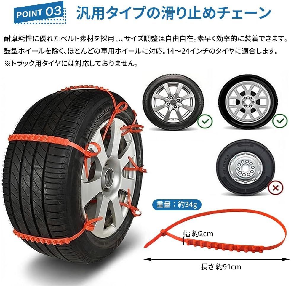 【汎用タイプ・非常時の備えに最適】14~24インチの多くの乗用車タイヤに対応(※鼓型ホイール・トラック用タイヤは非対応)、1セットで複数の車両に活用可能です。雪道、凍結路面、泥濘路、滑りやすい路面など幅広いシーンで活躍。コンパクトで車載常備にもおすすめ。