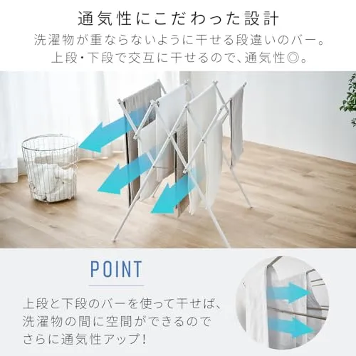 通気性にこだわった設計洗濯物が重ならないように干せる段違いのバー。上段・下段で交互に干せるので、通気性。