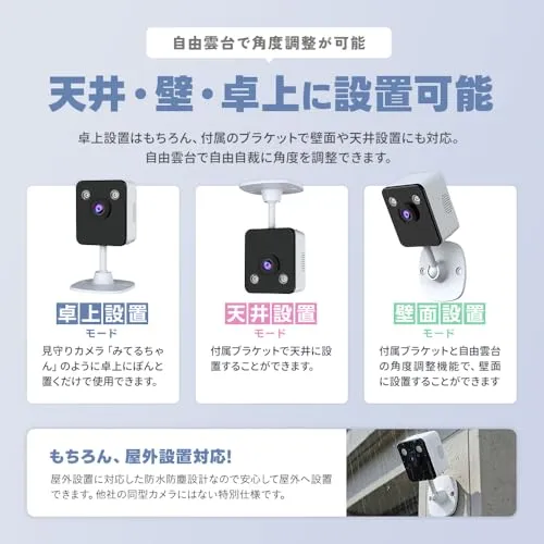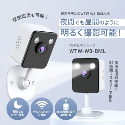 【WTW-W8-BMLはこんなカメラです】 小型で夜間に強いWiFi見守りカメラです!低照度撮影機能を搭載しているので夜間でも昼間のように明るく撮影ができ、24時間フルカラー撮影が可能です。自由雲台で角度調整ができるので、卓上、天井、壁面に設置が可能。自分の撮影したい場所に設置することができます。双方向通話機能や高画質500万画素、microSD対応など美馬織カメラに必要な機能が搭載されています。