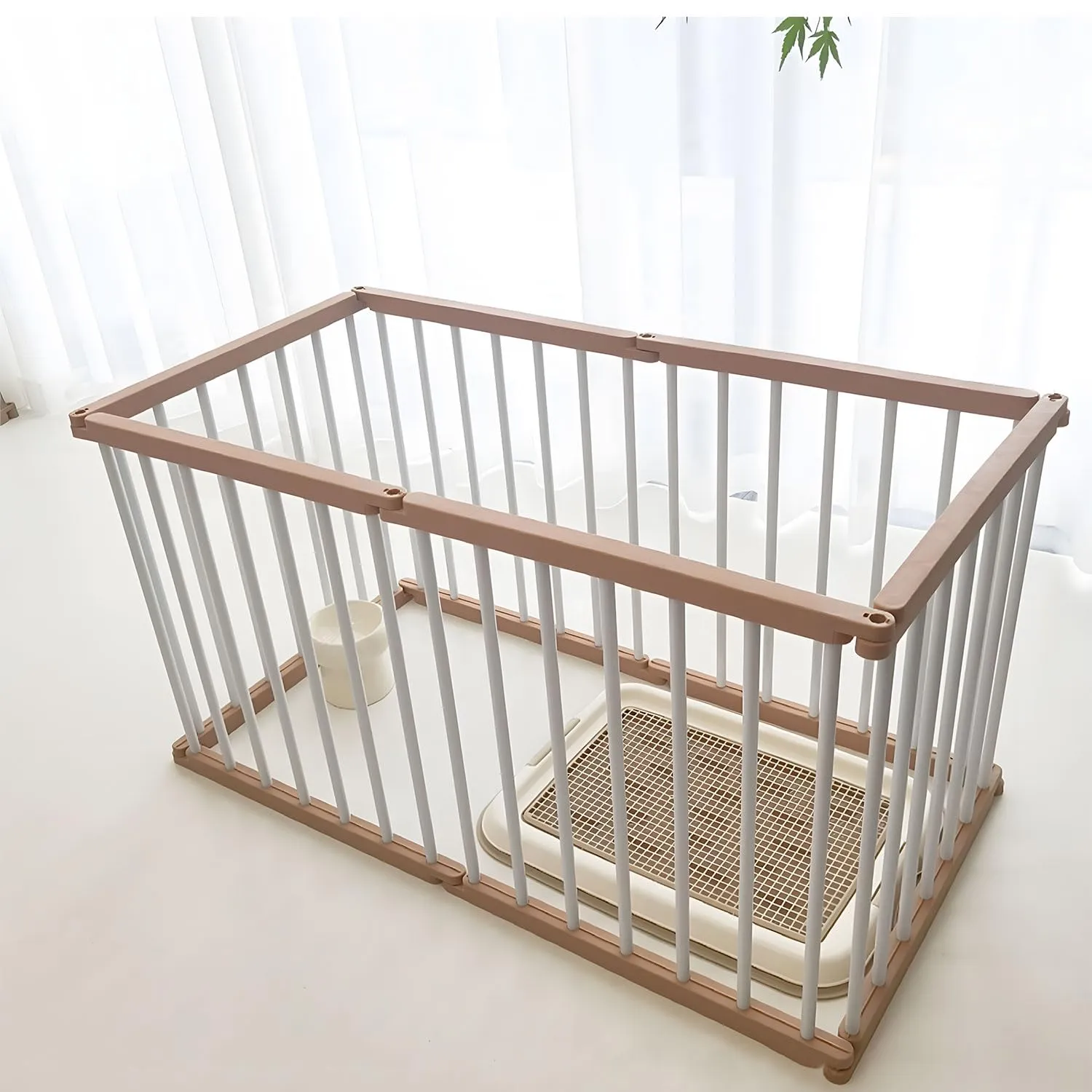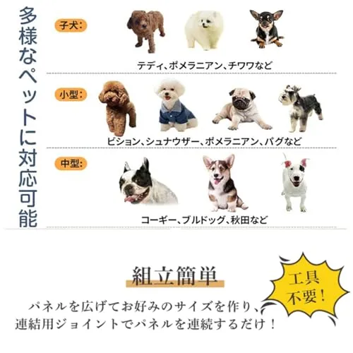 【自由に組み替え可能・広々スペース】 理論上は無限に組み立て可能なペットサークル。パネルを自由に連結でき、長方形・正方形・八角形・L字型など、使用シーンやお部屋のレイアウトに合わせて柔軟に設計できます。中型犬・大型犬にも対応し、ゆったりとした運動スペースを確保できます。