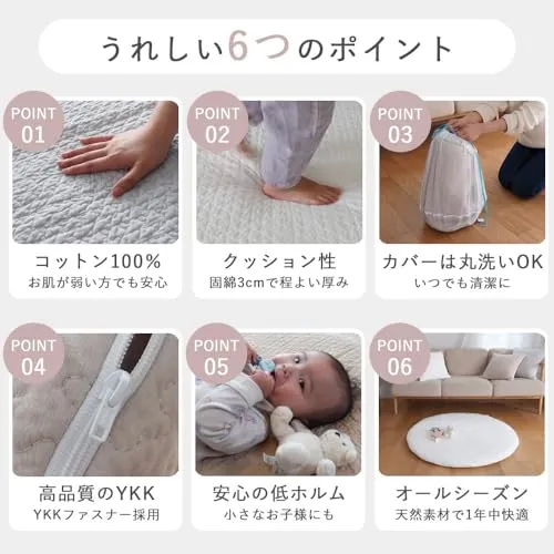 オールシーズン快適。夏はサラッと、冬はほんのりあたたかい。 ホットカーペット・床暖房OK。 場所を選ばず、コットン(綿)100%だからオールシーズンお使いいただけます。 持ち運びラクラクの軽量設計。女性も簡単に持ち運びができ、コンパクトにまとまるので収納も簡単です。 リビングでも使いやすいサイズ。リビング用の小さめマットや子供部屋に敷くマットとしてもおすすめです。