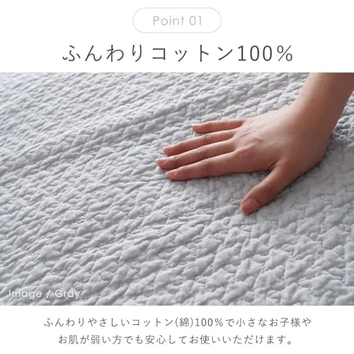 ※注意事項※以下の事例は不良品ではありません。 まれに黒い繊維が(綿殻)がある場合がありますが、天然素材の特性です。不良品ではありません。 本製品の生地は綿100%を使用しており、綿の特性上 摩擦が発生する場所は毛玉が発生いたします。 摩擦の度合いによってはたくさん発生する場合がありますが 気になる場合は小バサミ等で処理をお願いいたします。 まれに洗濯後に縫製糸が飛び出ることがございます。 その際には小バサミ等で処理をお願いいたします。 また、天然繊維の風合いを生かしているため、ラグなどの摩擦の強いご利用方法の 場合は、中綿の繊維が出る場合がございます。 キルト製品はサイズの誤差が生じます。 サイズ許容範囲は5%、?3%です。