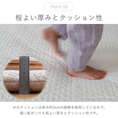 ふんわりやさしいコットン(綿)100%で小さなお子様や お肌が弱い方でも安心してお使いいただけます。 中のクッションは厚み約3cmの固綿を使用しているので、 寝転がっても程よい厚みとクッション性です。裏面は滑り止め付き。マルチに使えるベビーマットは赤ちゃんのお昼寝用マットとしてはもちろん、月齢フォトや寝相アートを撮る際もピッタリです。