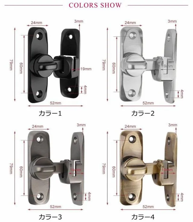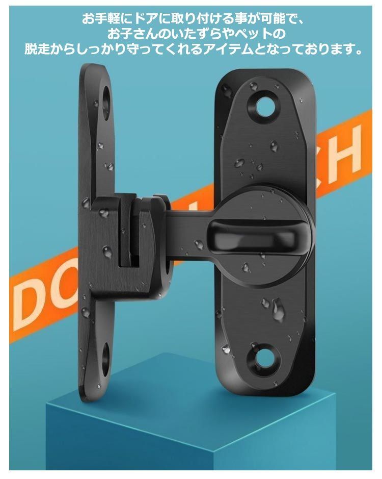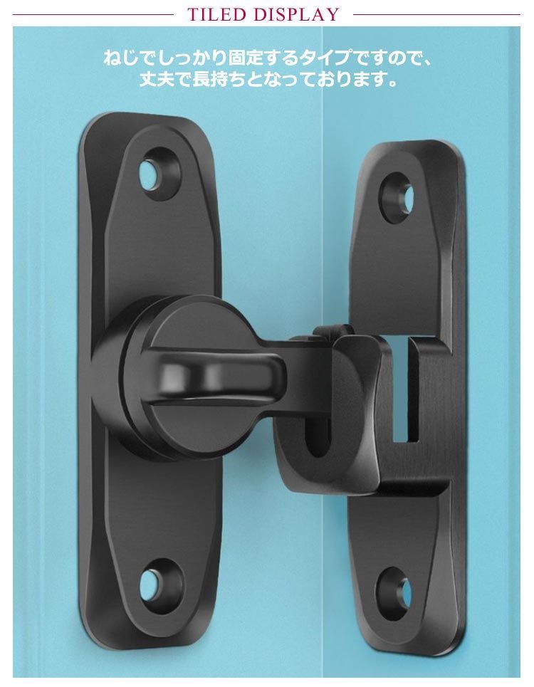 【回転式90°と180°の両用】 ねじでしっかり固定するタイプですので、丈夫で長持ちとなっております。 お手軽にドアに取り付ける事が可能で、お子さんのいたずらやペットの脱走からしっかり守ってくれるアイテムとなっております。 また、90度も180度も取り付けられるから、開き戸も引き戸も様々なドアに対応できます。 子供ケガ防止だけでなく、部屋の外に出ていかないようにしたり、様々な危険を防止できます。 防犯用、部屋のトイレの鍵、追加用の内鍵、部屋のドアに付け。プライバシーを守りながら、学生や独身者に向いている。防犯対策の安全 ロックです。 簡単施錠でスライドドアの防犯対策ができます。猫の脱走防止用としてもお使いいただけます。