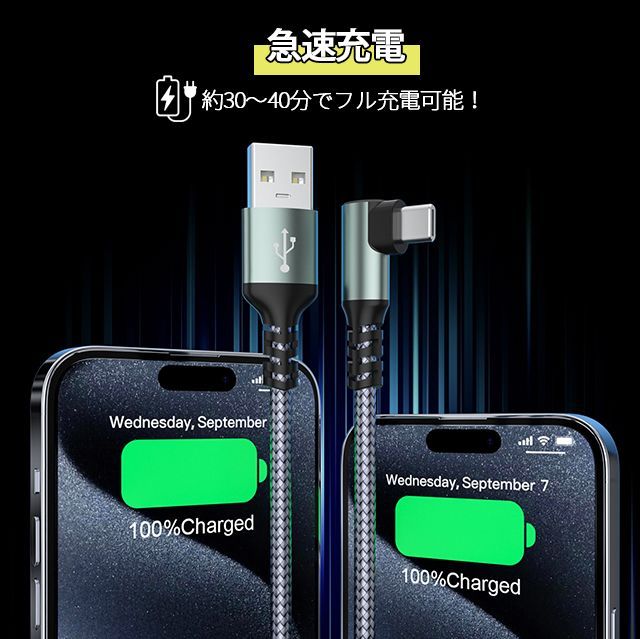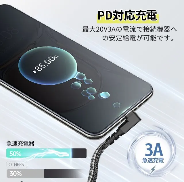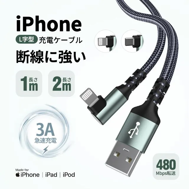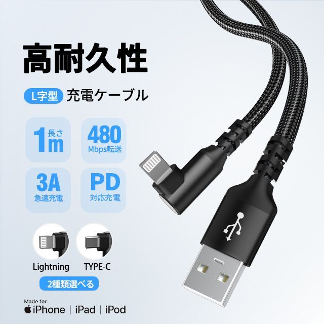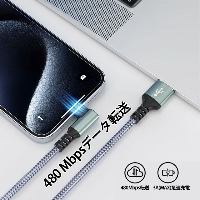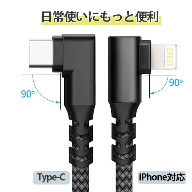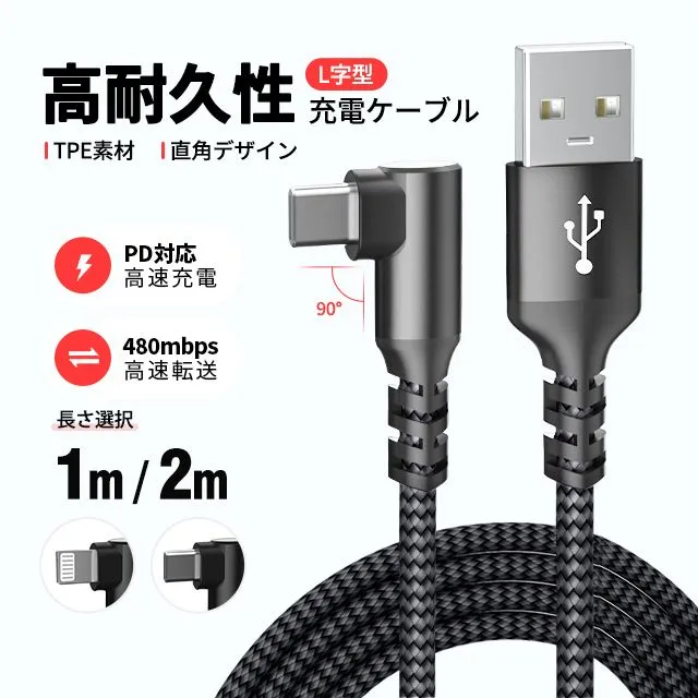【2本目半額】usb ケーブル 充電ケーブル ライトニング 横向き L字型 2A 3A type c lightning 長さ 1/2m TPU ナイロン編み 断線防止 急速充電 3A データ転送 KBC#
