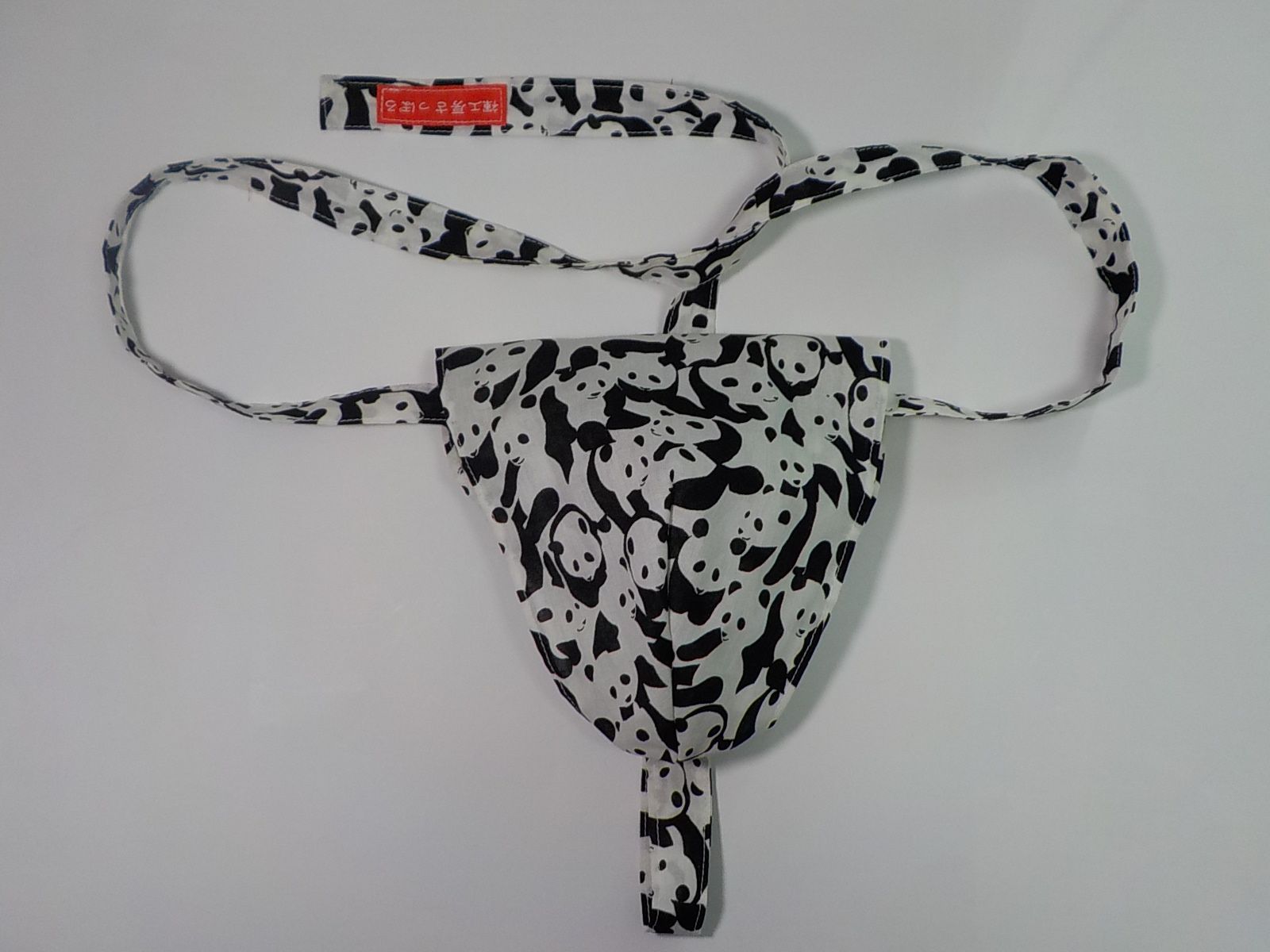 100%、白黒のぎっしりパンダ模様プリント生地で作った黒猫褌です。