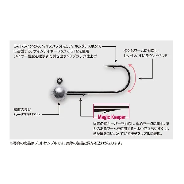 細みのワームをセットしてもシルエットを崩しにくく、ポテンシャルを最大限発揮するバーブキーパー(Magic Keeper)が特徴。キーパー部にウェイトを使用せず重心がヘッド一点に集中し、ボトムでエサをついばむ小魚をリアルに演出したり、もちろんシェイクリトリーブでのミドスト等にも使用可能。ライトラインを用いたフィネスメソッド用ジグヘッドのスタンダードモデルです。