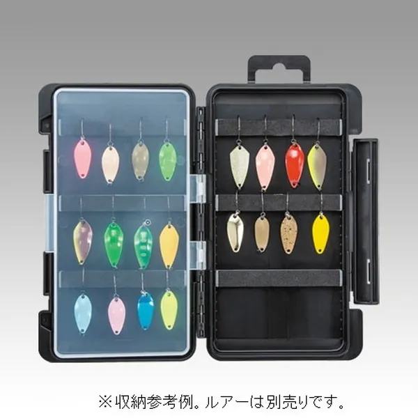 トラウトやライトゲームユーザー向けに開発した、使い勝手と収納力を両立する、観音開きの『薄型ワレット』両面収納ケース。収納部には、フォーム一体型の取替ボードを採用しているので、自在に収納構造をアレンジできます。向かい合って閉じるため、フックやスプーンが絡み合うのを防ぐパーテーションを搭載しているのでストレスなくスプーンを取り出せます。ランガンケース1010サイズなので、コンパクトに持ち運べ、VS-7070Nや7055Nの上段にシステム収納可能。