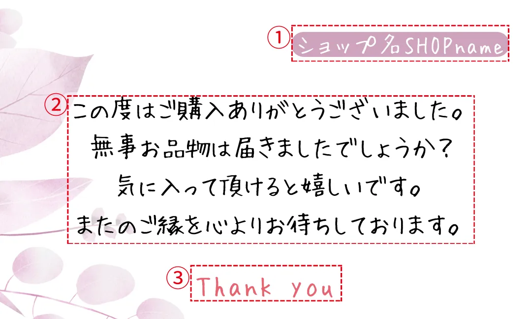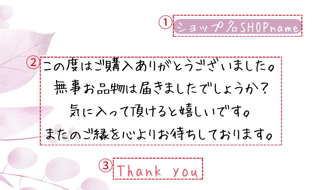 【メッセージ等のオーダー】 画像3枚目をご参考にしてください。 ①ショップ名 ②メインメッセージ ③サブメッセージ ①と③の配置交換可能です。 メッセージやショップ名なしの作成も可能です。 ☆オーダーいただいたデザインは1年間保存しております。 1年以内にリピートいただいた場合お値引きさせていただきます。