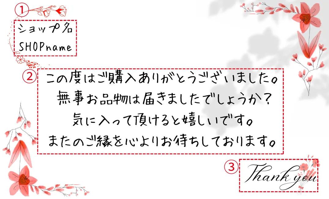 【メッセージ等のオーダー】 画像3枚目をご参考にしてください。 ①ショップ名 ②メインメッセージ ③サブメッセージ ①と③の配置交換可能です。 メッセージやショップ名なしの作成も可能です。 ☆オーダーいただいたデザインは1年間保存しております。 1年以内にリピートいただいた場合お値引きさせていただきます。