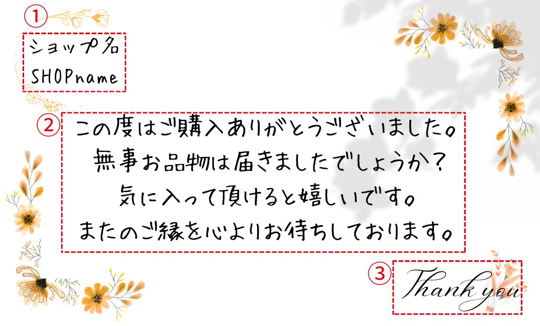 【メッセージ等のオーダー】 画像3枚目をご参考にしてください。 ①ショップ名 ②メインメッセージ ③サブメッセージ ①と③の配置交換可能です。 メッセージやショップ名なしの作成も可能です。 ☆オーダーいただいたデザインは1年間保存しております。 1年以内にリピートいただいた場合お値引きさせていただきます。