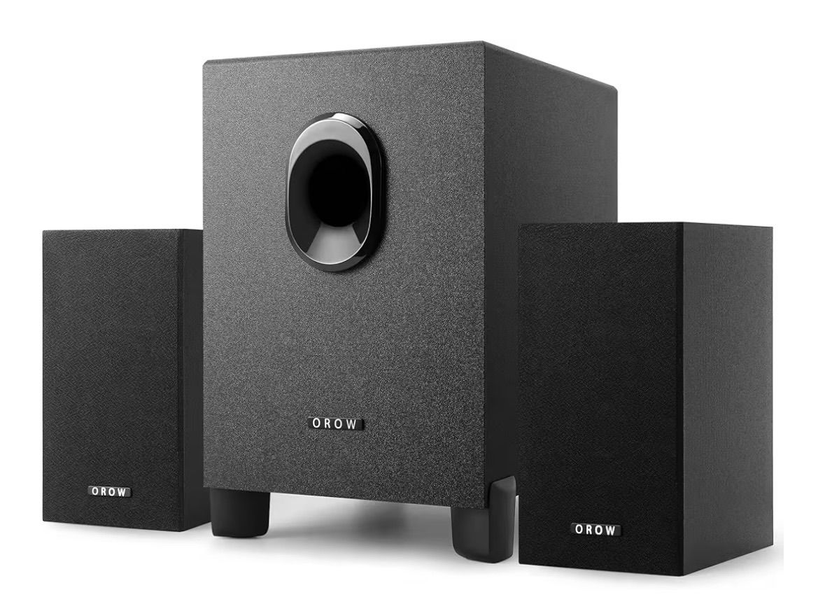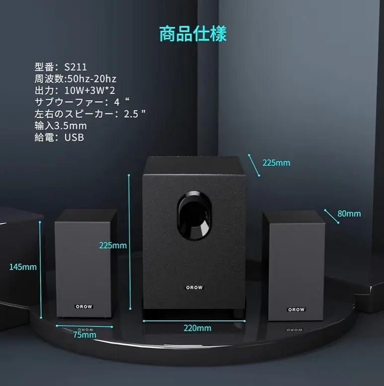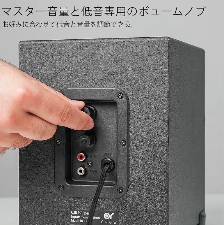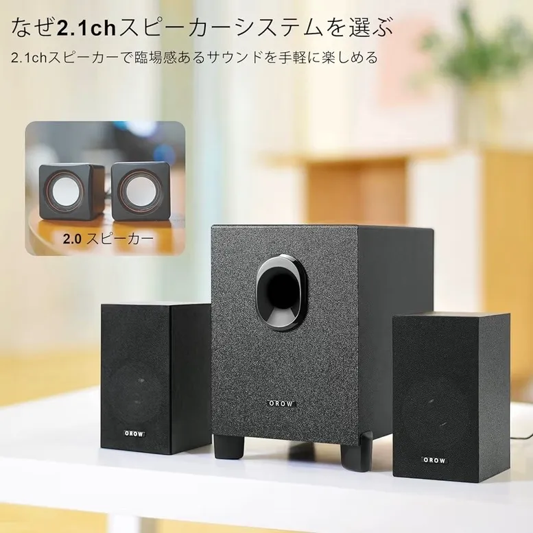 OROW PCスピーカー パソコン用 ステレオ 2.1ch サブウーファー 16W出力 usb スピーカー 重低音 スマホ テレビスピーカー ゲーミングスピーカー 3.5mm入力対応 木製 ブラック