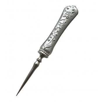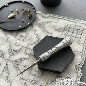 すずらんの花を身に纏った可憐な「なめらか目打」です。曲線が美しい本体の形状です。コンパクトで手におさまるような目打です。目打の先を削らず、生地や指を傷つけづらいなめらかな形状に仕上げました。
