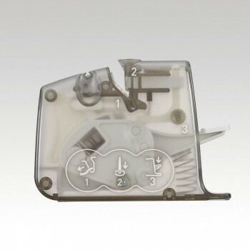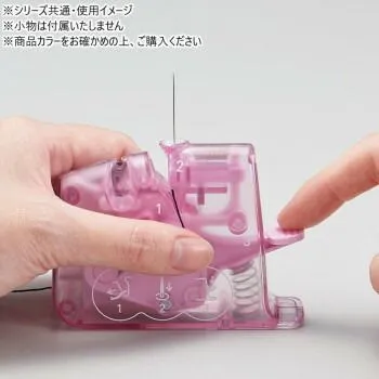 糸通し器として初の糸端が通り抜ける新機構です。針穴に糸が通り抜けるので、すぐに針仕事が始められます。細い針から太い針まで幅広い太さの針に対応しています。太さ0.46mmから0.89mmまでのソーイングやパッチワークのほとんどの「クロバー」の縫い針に糸通しができます。パッチワークの針で最も細い規格(0.46mm)にも対応しています。本体に凹みを作り、糸を押さえやすくしました。