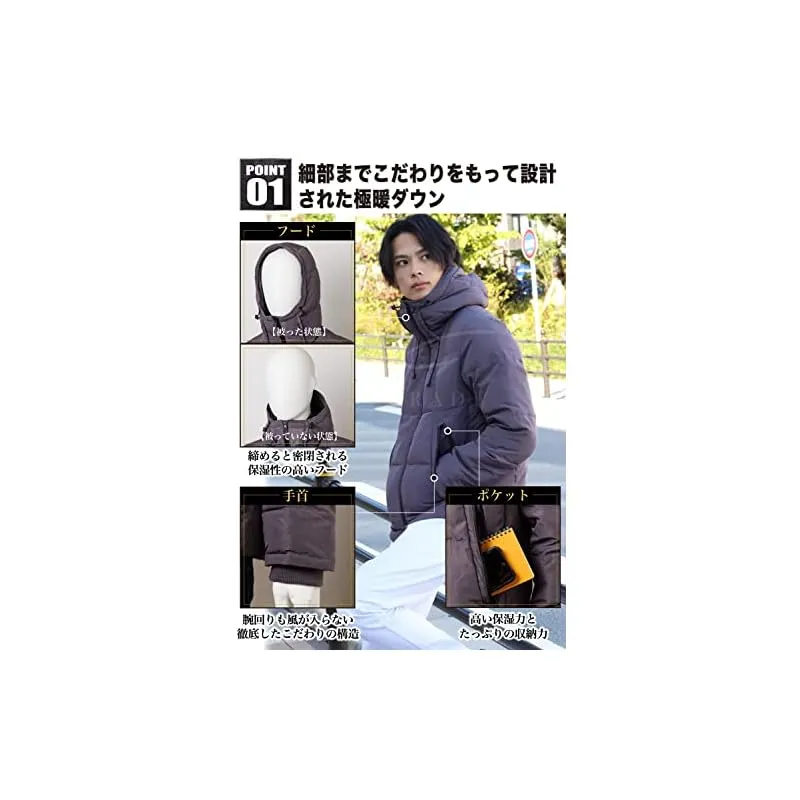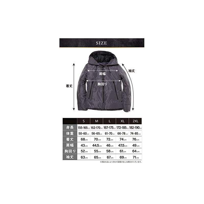 【 商品詳細 】生地・中綿共に高級ポリエステルを95%、ダウン5%使用。カラーはブラック、ネイビー、グレー、チャコールグレー。サイズはSサイズ、Mサイズ、Lサイズ、XLサイズ、XXLサイズをご用意しております。