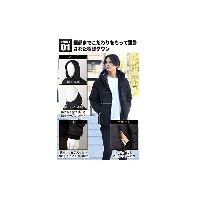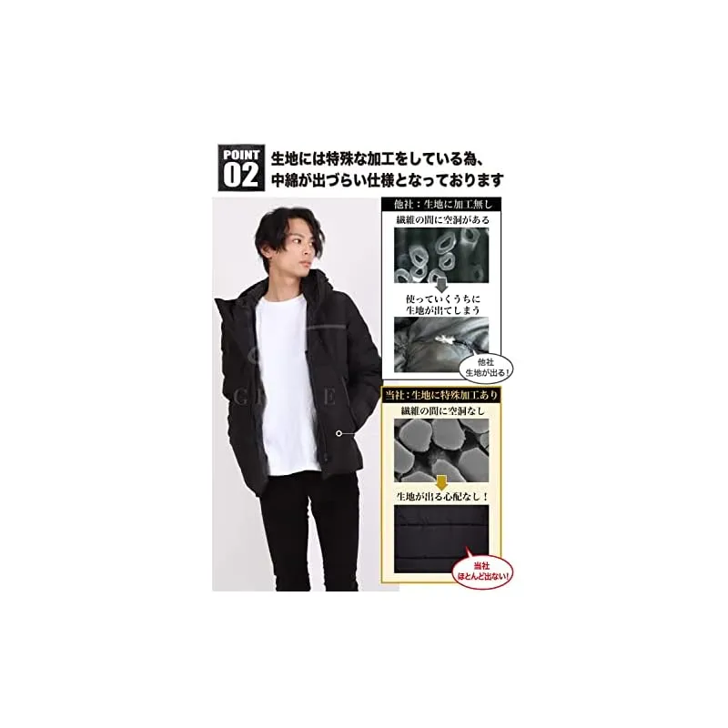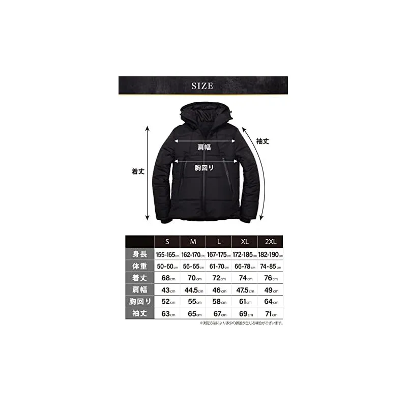 【 商品詳細 】生地・中綿共に高級ポリエステルを95%、ダウン5%使用。カラーはブラック、ネイビー、グレー、チャコールグレー。サイズはSサイズ、Mサイズ、Lサイズ、XLサイズ、XXLサイズをご用意しております。