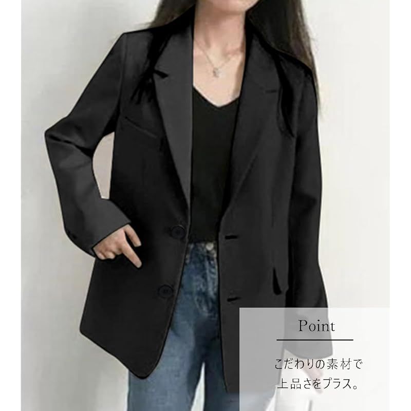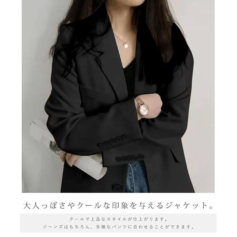 【商品概要】 大人キレイなコーデにぴったりな、こなれ感ただようテーラードジャケットです。 美しいラインを演出してくれる春秋コーデに欠かせないブラックジャケットは一つは持っていたいアイテムです。 体型カバーにもなるジャスト丈でレイヤードしやすいのが◎少しルーズなシルエットで快適にご着用頂けます。 シフォンプルオーバーとあわせてしっかりきめたり、デニムでカジュアルダウンしたトレンドライクな着こなしも◎ きれいめにもカジュアルにも合わせやすくオンオフ問わず幅広いシーンで着回しができるジャケットです。