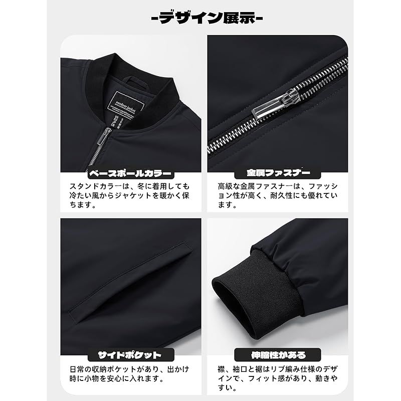 【商品詳細】 ブランド:TACVASEN 商品種別:メンズコート・ジャケット 商品名:[TACVASEN] ボンバージャケット メンズ 秋冬 ブルゾン 大きいサイズ 野球 防風 ジャンパー バイク ウェア 仕事 ポケット付き 無地 スタジャン ブラック 3XL 商品番号:FBATVS-273-black-3XL 商品内容:3XL 色:ブラック 商品タイプ:ミリタリー