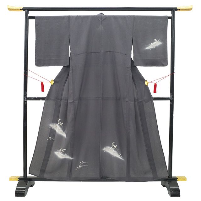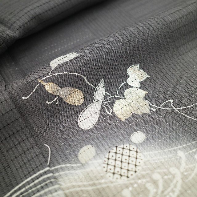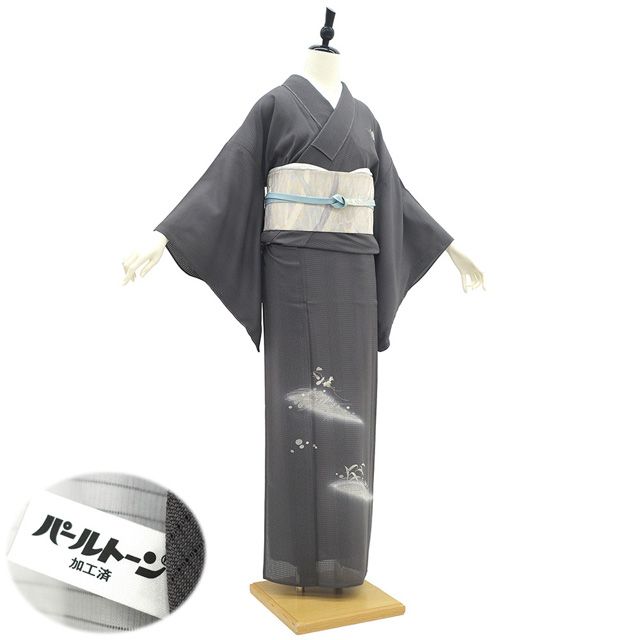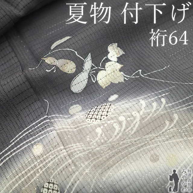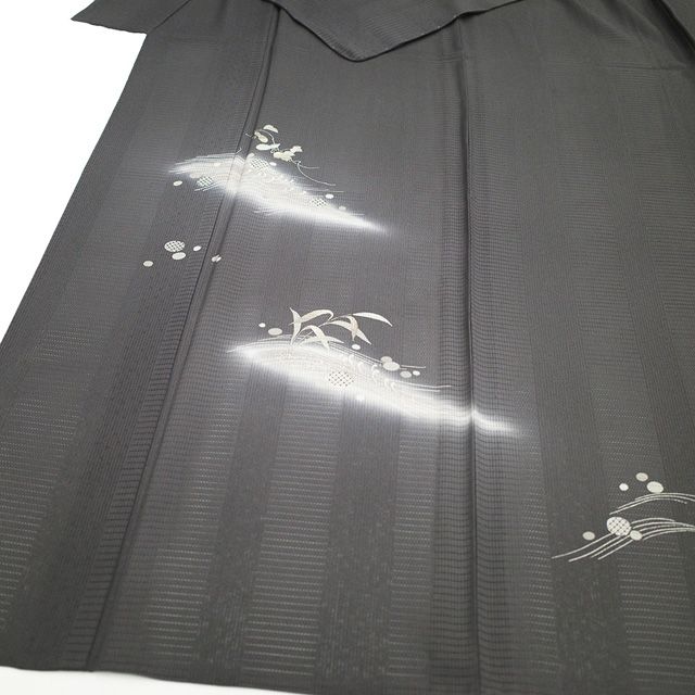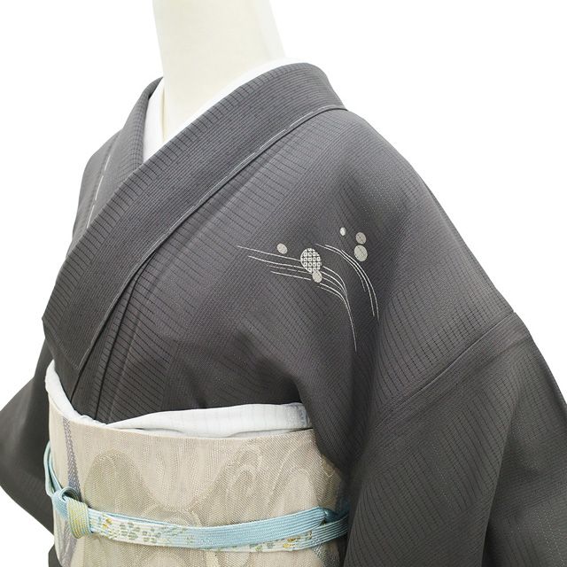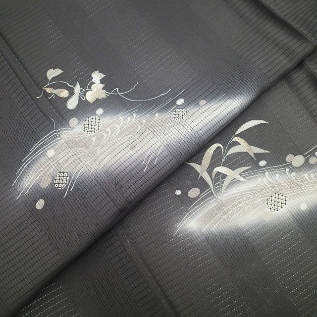 【 新古品 】 状態はバツグンに良いです!未使用品のとてもきれいなお品となります。 仕立て上がっておりますので、すぐにお召しになれますよ。 ▼商品説明 見た目・生地質ともに爽やかな上質な 夏物 絽 付下げ (仕立て上がり品)のご紹介です。 透け感をたっぷりと楽しめる変わり絽の生地は、落ち着きのある上品な濃グレー地。 そこに、流水・瓢箪・水文・蔦・葦 といった涼やかな意匠が丁寧に染め描かれています。 柄行には金銀彩加工が施されており、控えめながらも品のある煌めきが生まれ、夏の装いに涼感と華やぎを添えてくれます。 細かく丁寧な織り味で織り出された絽生地は、なんとも涼しげ。 さらりとした上質な正絹生地ですので 美しい透け感を存分に味わっていただけます。 大変おしゃれな夏の付下げでございますので、お目に留まりました方はこの機会に是非どうぞ。 ▼みやがわから一言 控えめな色合いに煌めく柄が、洗練された夏の装いを演出します。 ▼着用年齢 ご年齢を気にせずお召しになって頂けます。 合わせる帯や小物によっても印象が変わりますので、お好みのコーディネートをお楽しみ下さい。 30代 40代 50代 60代 70代 ~ と幅広く ▼お召しになる季節 絽のお着物は 7月と8月の盛夏はもちろん 6月や9月など単衣時季にもお召しになっていただけます。 また近年、5月下旬頃でも夏日のような日もございますので 気温に応じて心地よいおしゃれを お楽しみいただけたらと思います。 ▼合わせる帯 金銀糸の織り込まれた袋帯を合わせて 訪問着 と同じ用途で。 染めの名古屋帯を合わせてちょっとしたお出掛け・パーティーに。 付下げ は、合わせる帯によって フォーマル から セミフォーマル まで幅広くお召しになれます。 ▼着用シーン ・ 結婚式 ・ 披露宴 ・ 謝恩会 ・ 結納 ・ 挨拶回り ・ お祝い ・ パーティー ・ お茶会 ・ 観劇 ・ お食事 ・ ショッピング など