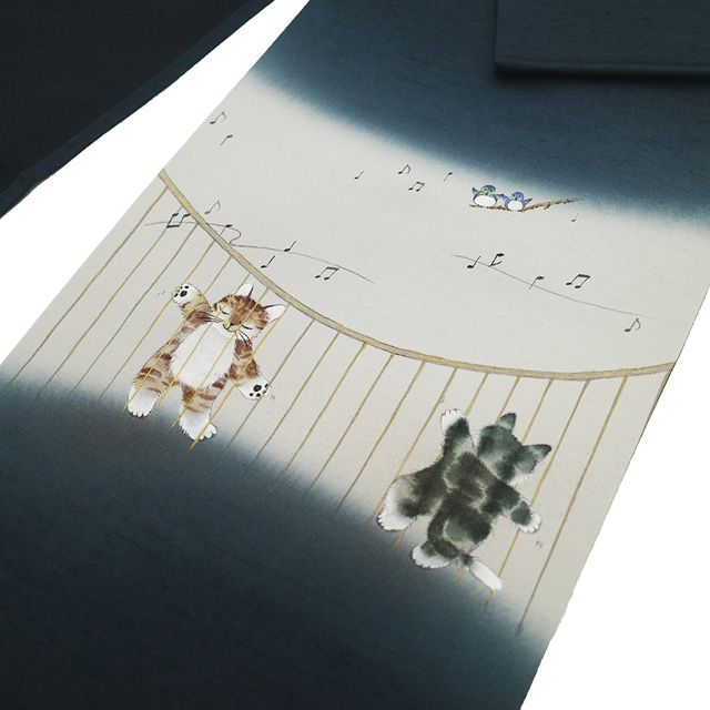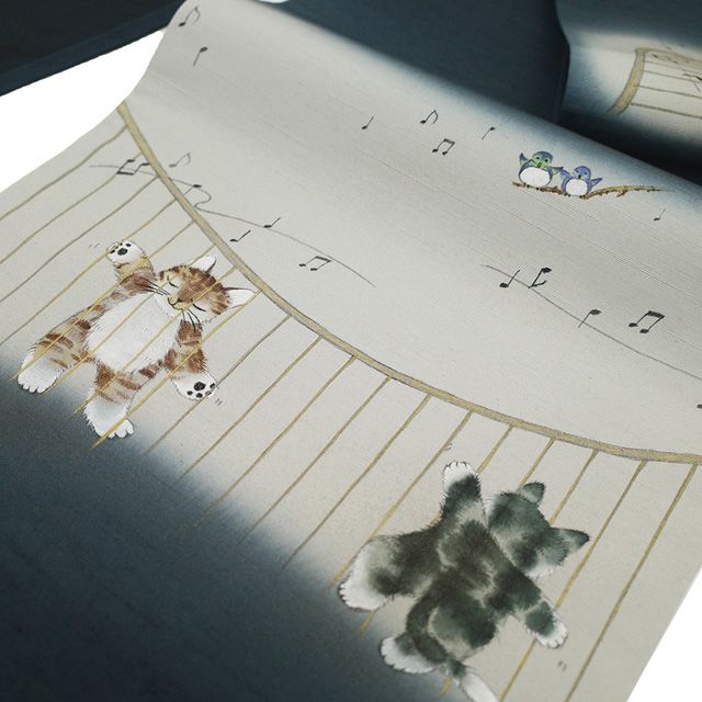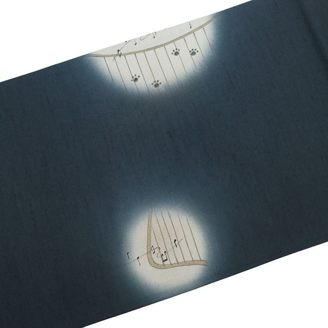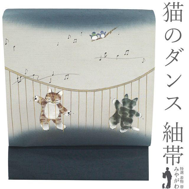 【新古品】 名古屋帯 未使用 正絹 紬 手描き 濃紺 グレー 猫のダンス 猫 ねこ ネコ 小鳥 音符 作家物のようなデザイン カジュアル 春 秋 冬 上質 なごや帯 開き名古屋帯 九寸 美品 仕立て上がり みやがわ sb55198 上記の価格は全て 税込み です お品物:bsol 1835/7752 千 90/30/6202 未使用 新古品 名古屋帯