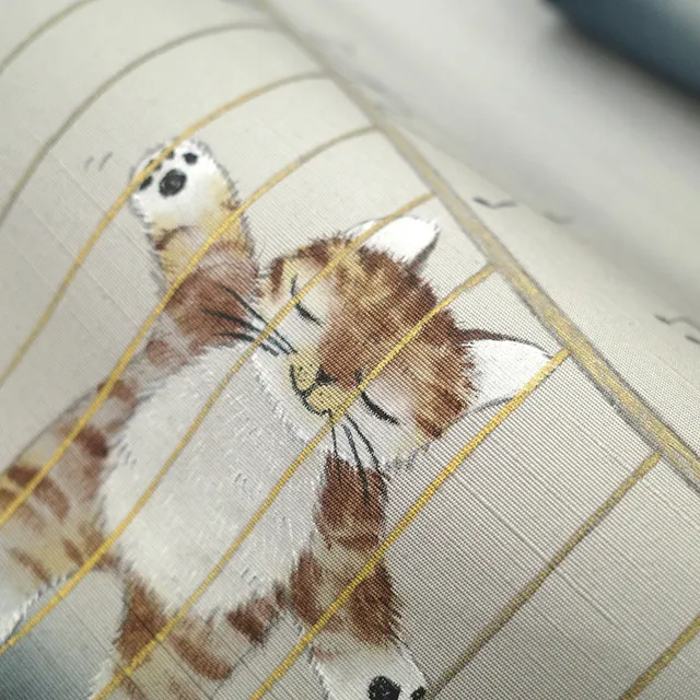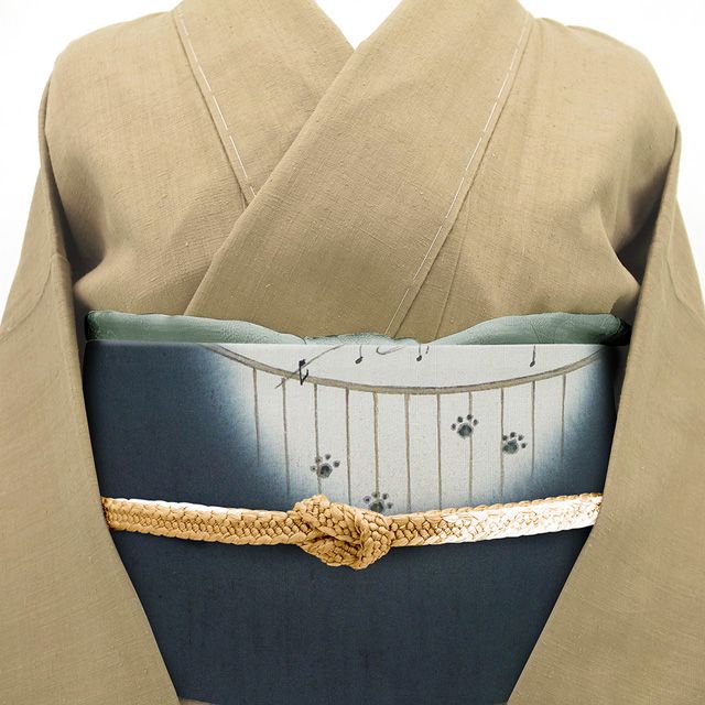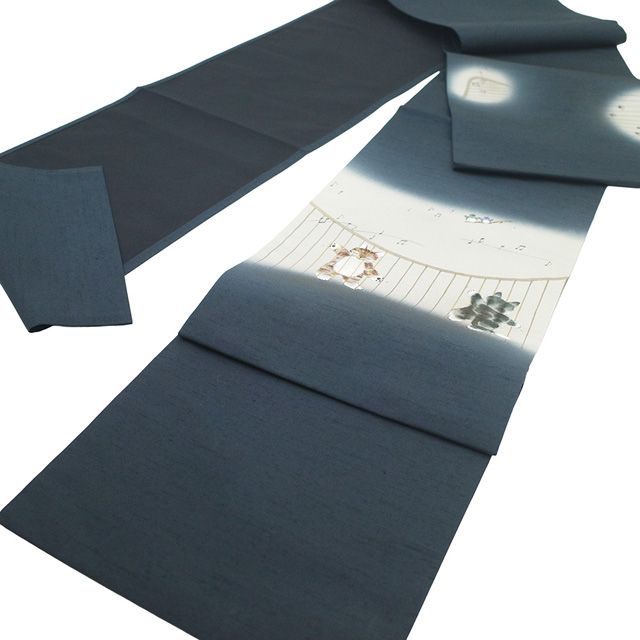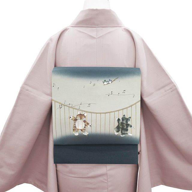 【 新古品 】 状態はバツグンに良いです!未使用品のとてもきれいなお品となります。 仕立て上がっておりますので、すぐにお召しになれますよ。 ▼商品説明 かわいいデザインの 開き 名古屋帯 (仕立て上がり品)のご紹介です。 味わい深い濃紺×グレーの上質な紬地。 素朴さの中にも温かみを感じさせる、やわらかな風合いが魅力です。 帯地の上には、ダンスをする猫と小鳥、音符が描かれた遊び心あふれるデザイン。 大きなハーブを演奏する猫にも見えるユーモアのある意匠で、見ているだけで楽しい気分になります。 柄行には金銀彩加工も施され、さりげない光沢が上品なアクセントに。 可愛らしさの中にも大人の洒落感が漂います。 帯地は紬ならではのほどよいハリを持ちながらもしなやかで、締めやすく、美しいお太鼓をすっきりと作っていただけます。 大変素敵な 名古屋帯 となっております。 お目に留まりました方はこの機会に是非どうぞ。 ▼みやがわから一言 可愛らしさと洒落感を兼ね備えた、着物姿にさりげなく大人の可愛らしさを演出する一本です。 ▼お召しになる季節 こちらの帯は、10~5月( 秋 ・ 冬 ・ 春 )の袷の お着物 に合わせていただけます。 ▼合わせるお着物・着用シーン