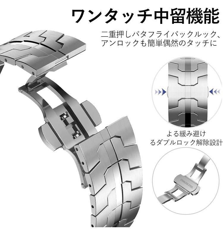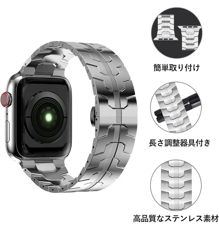【高品質なステンレス素材】Apple Watch にぴったりフィットすると交換バンド一体化ステンレスバンドです。耐腐食性、耐摩耗性、耐酸性の高品質ステンレス素材を採用、耐久性に優れています。精密な研磨技術と使いやすくファッショナブルな設計となっており、高級感あふれるApple Watchベルトとなっています。