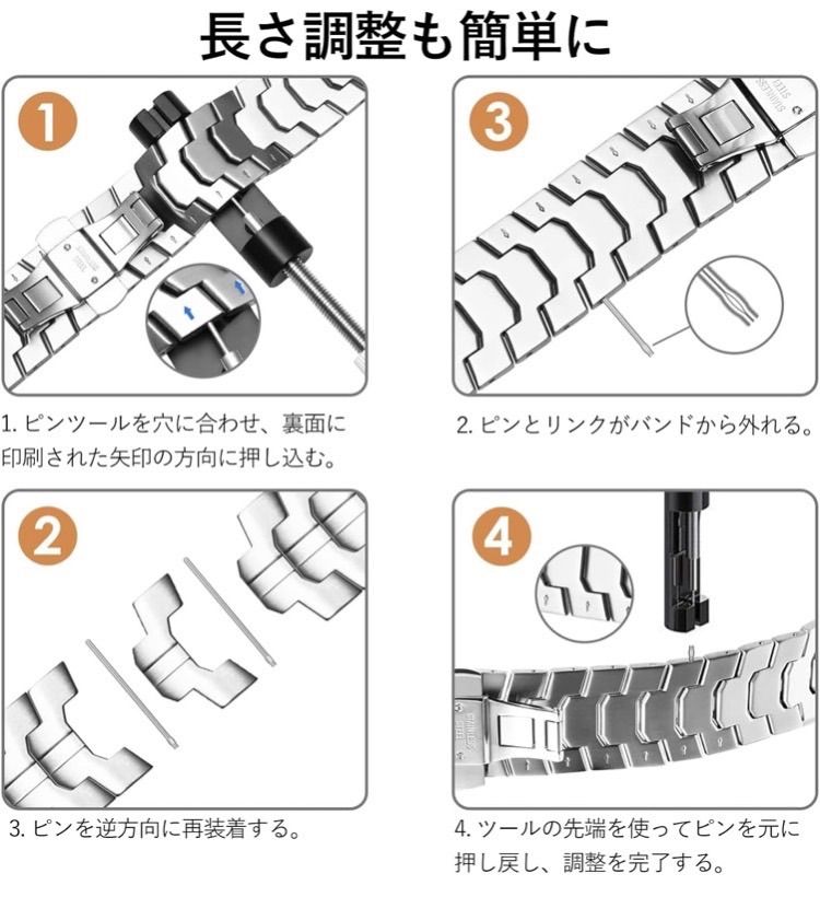 【調整工具付&簡単装着】ステンレススチールのバンドはご自身の腕周りの長さに応じて調整が必要です。購入後すぐに使用できるように調整工具をapple watchステンレスバンドと一緒にボックスに入れてお届けいたします。長さ調整可能なので、付属された工具で自分の場合によって自由に調節できます。バンドサイズ:140mm-230mm。