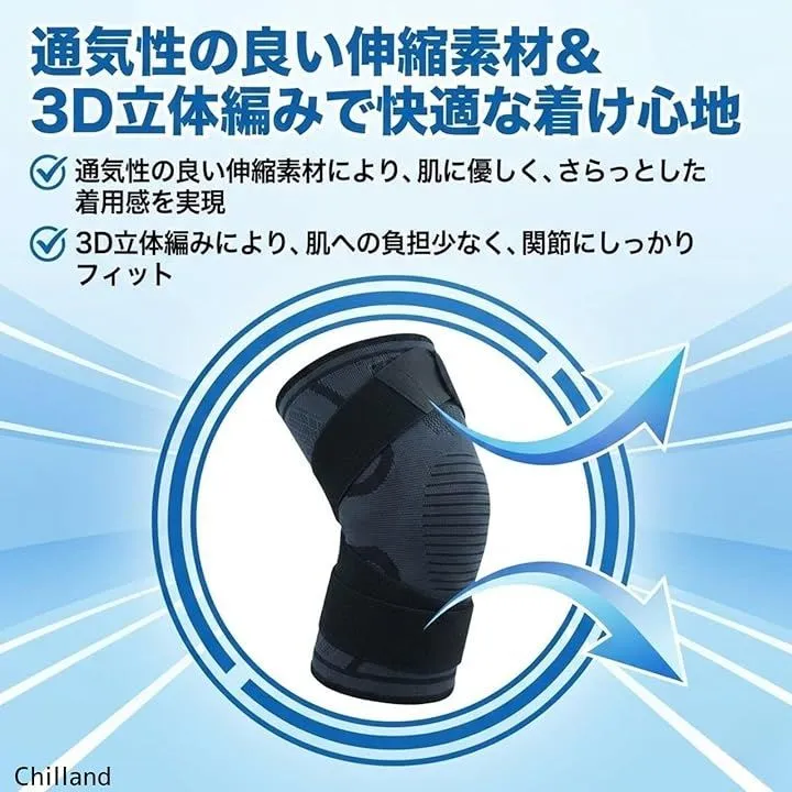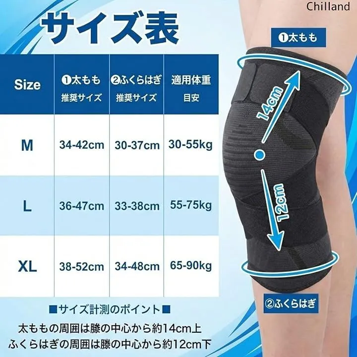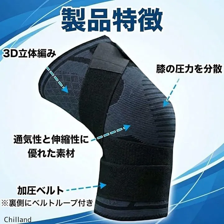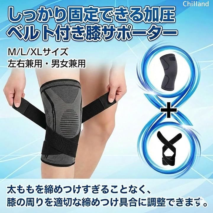 Chilland 膝サポーター 加圧ベルト付 スポーツ アウトドア 登山 薄い 通気性 伸縮性 男女兼用 左右兼用 (ブラック, XL)