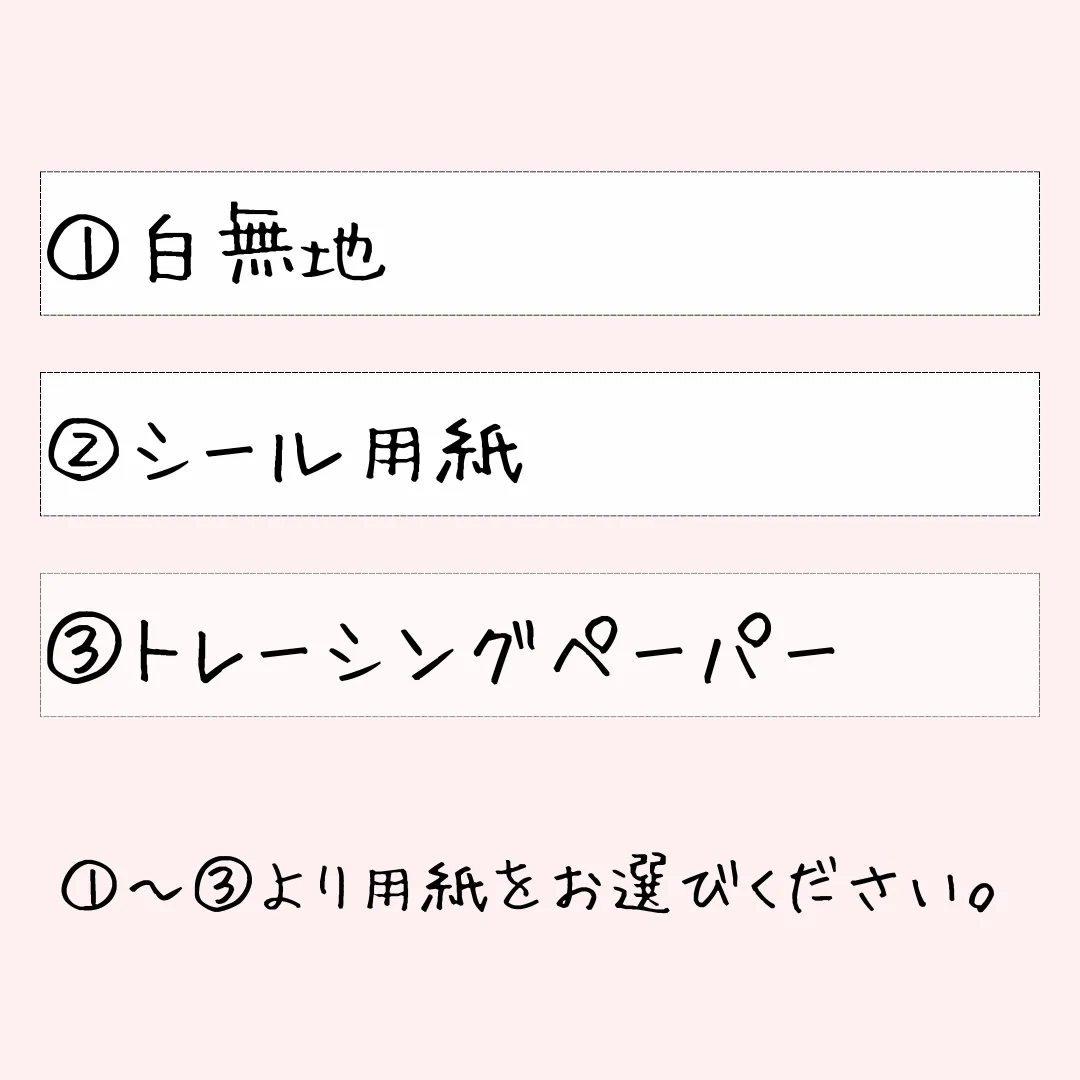【用紙】 ①白無地 マット紙、日本製 約0.6g/枚 厚さ:0.155mm(コピー用紙2枚程度) ②シール用紙 マット紙 厚さ:0.1mm ③トレーシングペーパー 約0.3g/枚 厚口73g/m2(しっかりめのトレーシングペーパーです)
