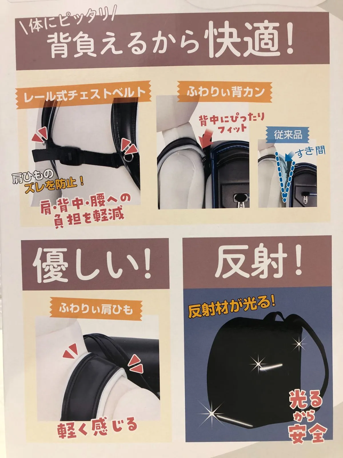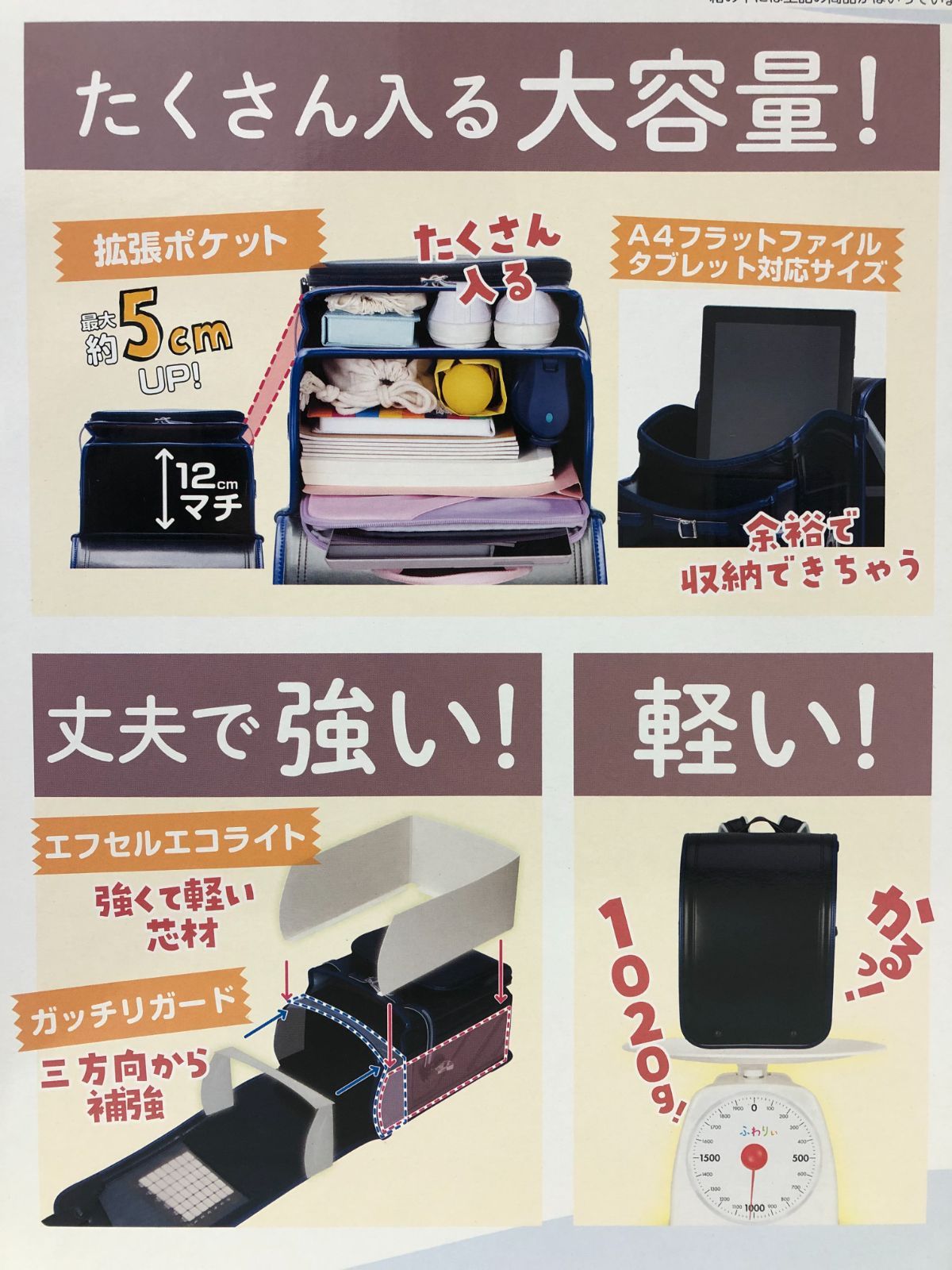 ■□ 商品の特徴 ・マチ幅12cm ・最大5cmまで調節可能な拡張ポケット ・A4フラットファイル対応サイズ ・タブレット対応サイズ ・「 ふわりぃ背カン + ふわりぃ肩ひも 」で安定感・フィット感UP ・チェストベルト付 シンプルで飽きのこないデザインのランドセル マチ幅12cm+最大5cmまで調節可能な拡張ポケットで収納力が更にアップ 付属のチェストベルトはズレ・揺れを防ぎ、体に密着して背負えるので、お子様の通学の負担を軽減します 反射材をプラスした “ 超光 ” 機能で、暗い所でも車のヘッドライトをしっかり反射します [コンディション] こちらの商品はアウトレット/展示品となります。 保管(展示)状態などにより本体及び付属品に多少の汚れや イタミがある場合がございます。 分かる範囲では写真にて掲載いたしますが、 あらかじめご了承ください。