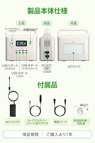 多摩電子工業 200Wポータブル電源 リチウムイオンバッテリー TL152W-KW 227Wh 62400mAh 軽量 小型 正弦波 USB-C 急速充電 PD対応 LEDライト搭載 ホワイトshun