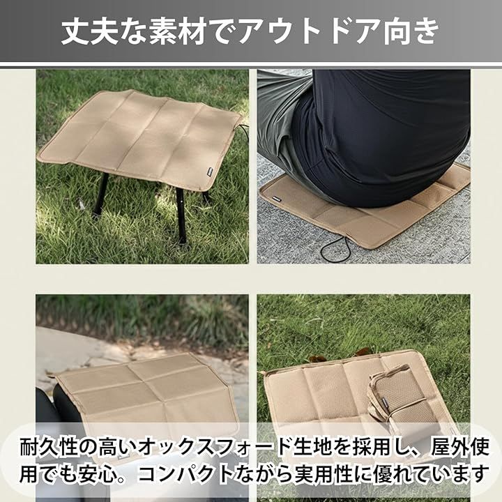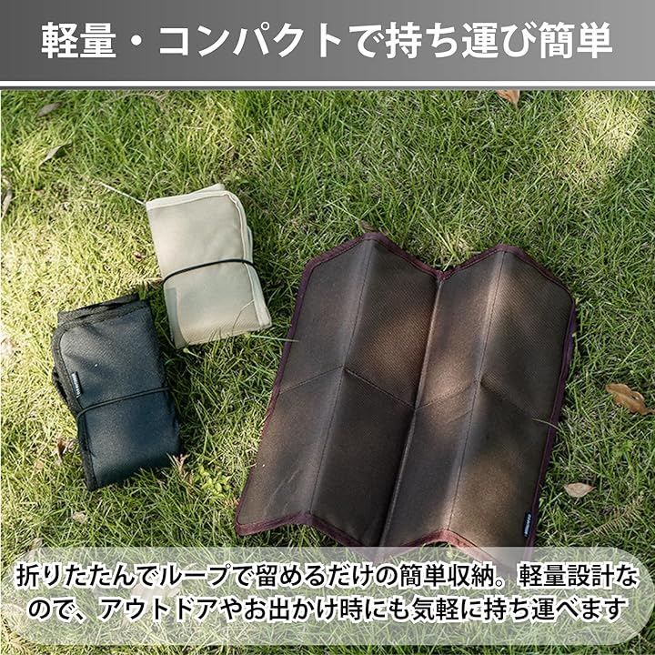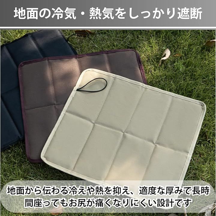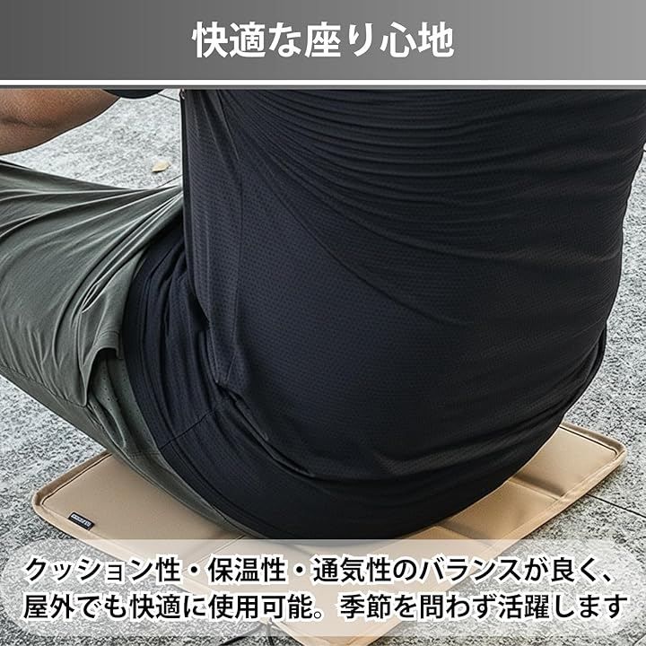 「地面の冷気・熱気をしっかり遮断」 地面から伝わる冷えや熱を抑え、適度な厚みで長時間座ってもお尻が痛くなりにくい設計です。