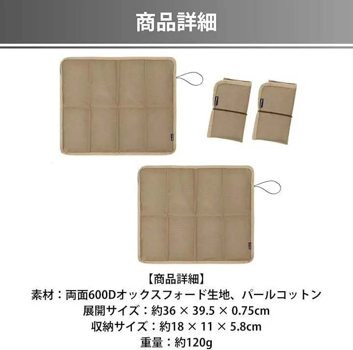 「商品詳細」素材:両面600Dオックスフォード生地、パールコットン 展開サイズ:約36 x 39.5 x 0.75cm 収納サイズ:約18 x 11 x 5.8cm 重量:約120g