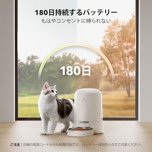 【無制限の置き場所】PETLIBRO AIR 自動給餌器はバッテリー駆動に対応しており(電池は付属していない)、D型乾電池を3本装着すれば、最大180日間使用できる。電源コンセントの制限を受けなくなったので、猫の好きな場所に自由に給餌器を置くことができる。配線を整理する手間が省け、家がすっきりする。さらに、ペットが電源コードをかじる心配もないので、より安全・安心。*同梱の電源コードからも給電可能、お好きな給電方式を自由に選択。