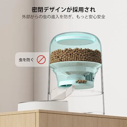 【いつでも開封したてのおいしさ】2023新登場のPETLIBRO自動給餌器AIRはこれまでのお客様の声を集め、基本的な給餌機能を満たすとともに、フードの新鮮さに焦点を当て、製品改良を行った。給餌器の蓋はシリコンストリップを内蔵し、しっかり閉まって湿気を寄せ付けない。また、ベース部分のローターは密封設計を採用し、給餌時間を除いて、タンク内部とフード排出口に隙間がなく密封状態を維持し、虫の侵入を防止する。このような厳密な設計により、ペットが食べるすべてのフードが新鮮で、衛生的であることを保証します。