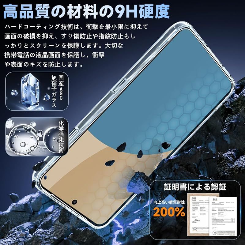 【高品質の材料の9H硬度】 とレンズ保護フィルムはすべて旭硝子で作られており、スマホ保護フィルムの中で最高レベルの9H硬度に達しています、4.5時間以上の高温焼入れ処理を行い、スクリーンプロテクターの圧強度は 125mpa に達し、通常 ガラス の 5 倍になりました。しかもスクリーンプロテクターは衝撃を抑えるシリコンコーティングを内蔵しており、万が一ガラスが割れても、ガラスの破片が飛散しません。ハードコーティング技術は、衝撃を最小限に抑えて画面の破損を抑え、すり傷防止や指紋防止もしっかりとスクリーンを保護します。 *大切な携帯電話の液晶画面を保護し、衝撃や表面のキズを防止します。