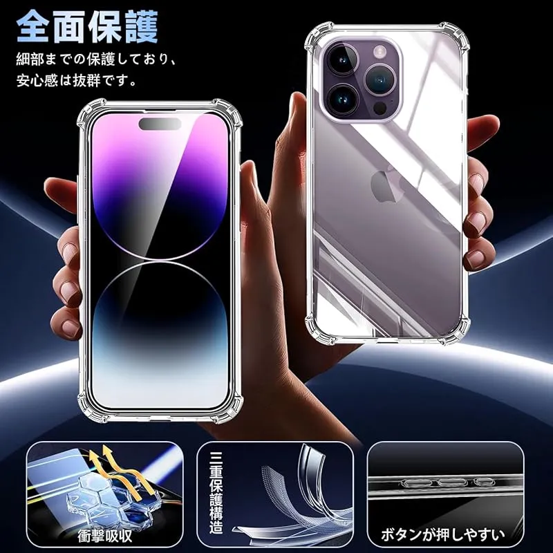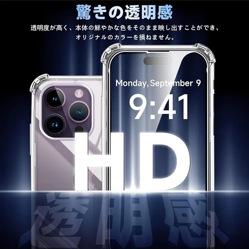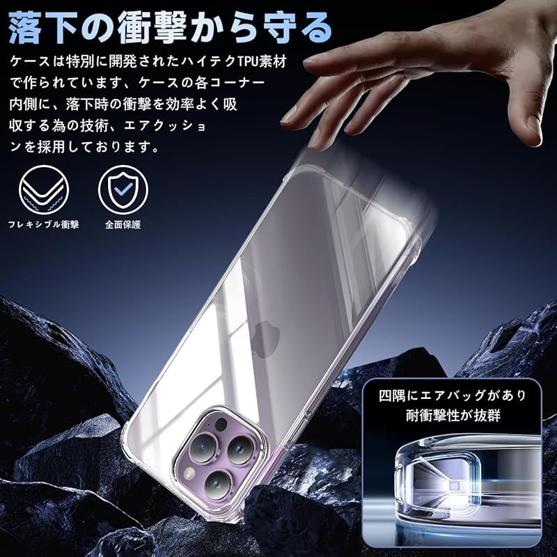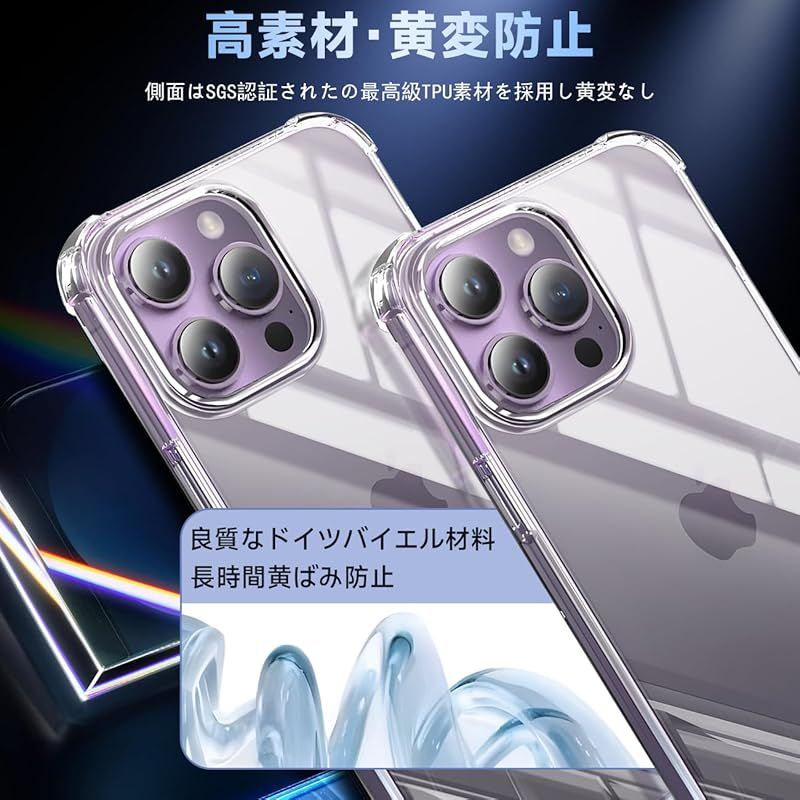 【360°フルガード 軍用グレード、高い耐衝撃性】 本製品はに対応 apple iPhone14 Pro アイフォン14 Pro あいほん14 Pro 6.1インチ する透明ケースです。外側のシェルは高い耐黄い耐性を備えた最先端技術ADMを採用しております。しかも環境にやさしく、無毒で無味の高品質の素材を使用して、酸化防止処理しており、長年でも黄色くなりません。多数回のテストした後、2mの高さで様々な角度から26回落としましたが、携帯電話が全然傷がありませんでした!更に四隅の耐衝撃性は通常の携帯電話ケースの5倍に達し、携帯電話を全面的に保護できます。(ご注意:ご購入前機種をよくご確認くださいね。間違った機種の購入による使えないことを避けてください)