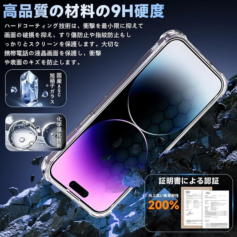 【専用設計・簡単に貼り付け】apple iPhone14 Pro アイフォン14 Pro あいほん14 Pro 6.1インチ 専用液晶画面保護ガラスフィルム。 本商品は日本素材のAGC 旭硝子 素材を採用して作られております。 フィルムのシリコン自己吸着層により、スチールフィルムを携帯電話に合わせて軽く置くだけで、気泡が入らないように簡単に取り付けられます。 (重点説明:フロントカメラのカメラ穴についてですが、ほこり・異物などの堆積を防止するため、ガラスフィルムにカメラ穴を開けていません。Seninhiのガラスフィルム 、通過率は99.9%なので、フロントカメラの正常使用に全く影響が出ません。) *モデルによってサイズが異なりますので、モデルを確認してご購入ください。