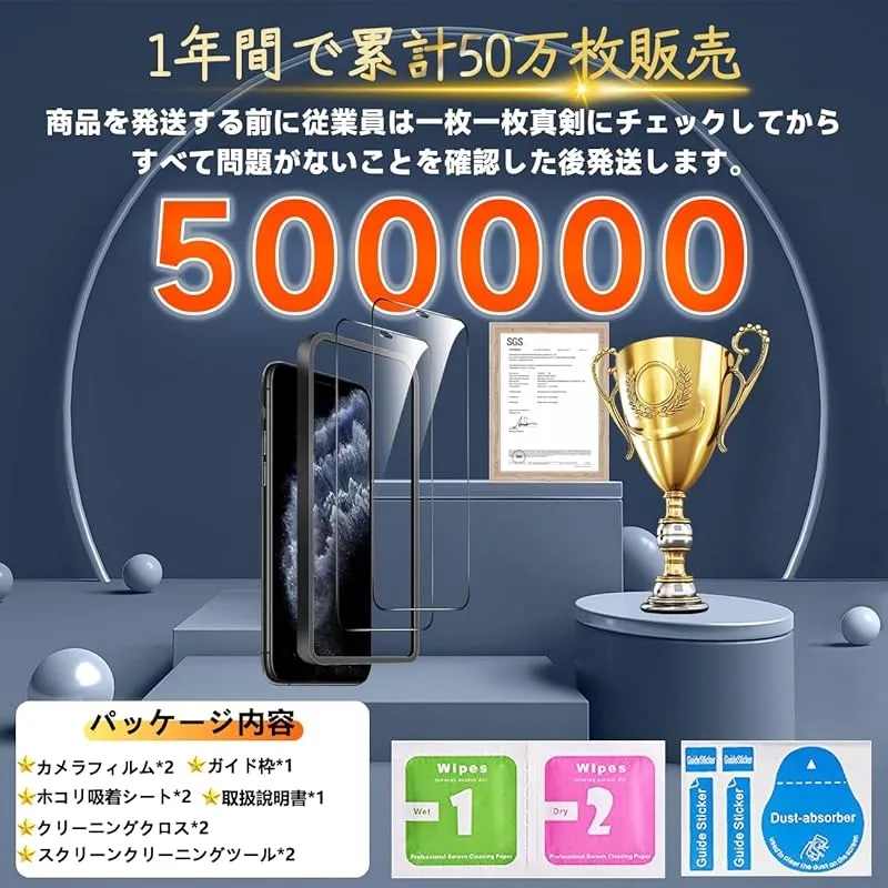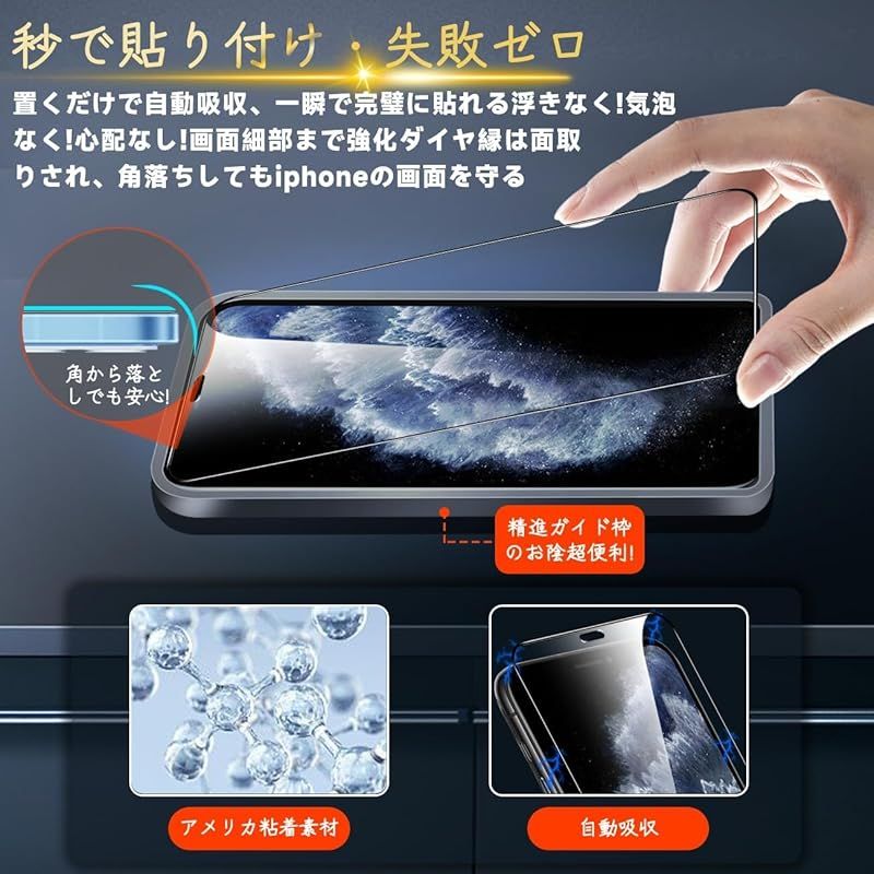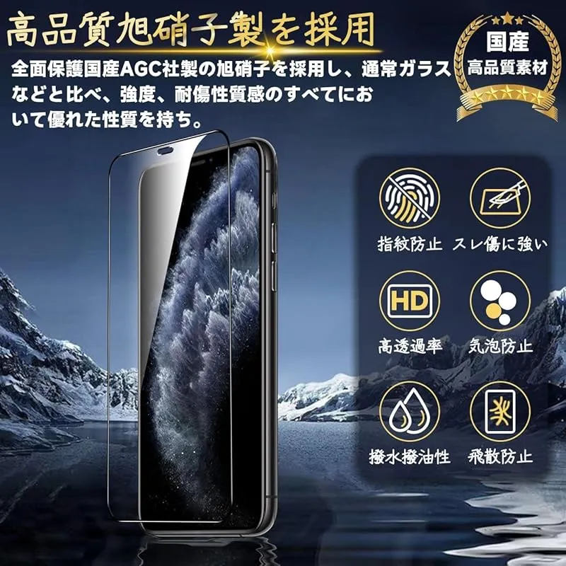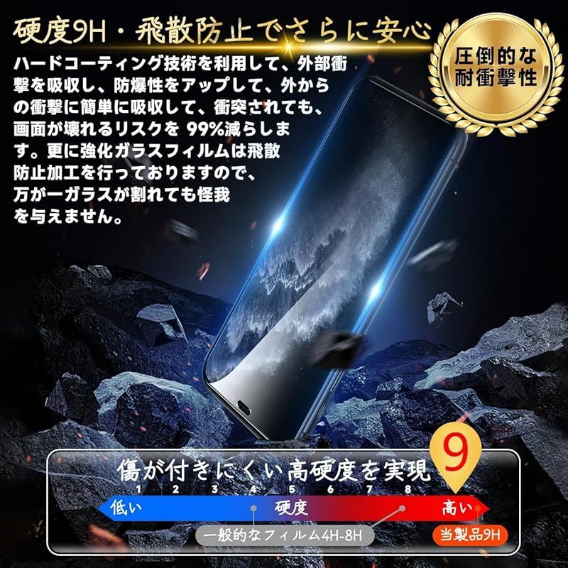 【高品質材質・9H硬度】 ガラスフィルムとレンズ保護フィルムはすべて旭硝子で作られており、スマホ保護フィルムの中で最高レベルの9H硬度に達します。しかも4.5時間以上の高温焼入れ処理を行い、スクリーンプロテクターの圧強度は125mpaに達し、通常 ガラス の 5 倍になりました。スクリーンプロテクターは衝撃を抑えるシリコンコーティングを内蔵しており、万が一ガラスが割れても、ガラスの破片が飛散しません。ハードコーティング技術は、衝撃を最小限に抑えて画面の破損を防止し、すり傷防止や指紋防止もしっかりしております。*大切な携帯電話の液晶画面を保護し、衝撃や表面のキズを防止します。