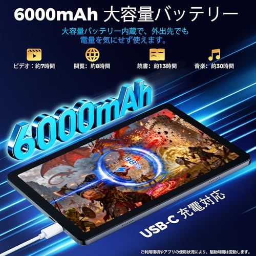 【20GB64GB最大1TB拡張6000mAh大容量バッテリー】 この10インチタブレットは、合計20GB(4GB RAM16GB拡張メモリ)の大容量メモリを搭載し、複数のアプリを同時に起動してもサクサク動作します。64GBの内蔵ストレージに加え、microSDカードで最大1TBまで拡張可能。電子書籍や写真、動画などのデータも余裕をもって保存でき、容量不足の心配はありません。さらに、60