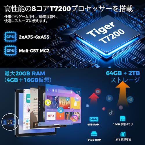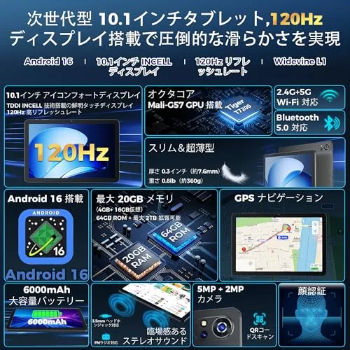 【専用ケース付き Android16 タブレット 10インチ 】120Hz高いリフレッシュレート Gemini AI 高性能T7200 8コアCPU 20GB+64GB+2TB拡張、6000mAhバッテリー、薄型軽量 Widevine L1&Netflixri