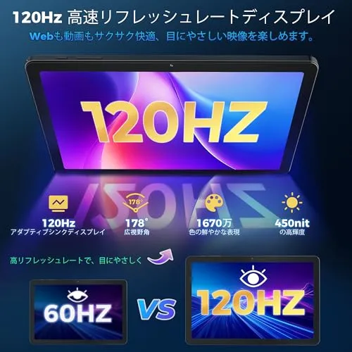 【120Hzリフレッシュレート対応!】この10.1インチのタブレットは、120Hzのリフレッシュレートに対応しており、スクロールやゲームプレイ、アプリの操作が非常に滑らかで、画面の動きが途切れることなく、より直感的で快適な操作が可能です。また、解像度1280x800のIncell IPSディスプレイを搭載し、広視野角と鮮明な色彩で映画やゲーム、電子書籍などを臨場感たっぷりに楽しむことができます。さらに、TDDIタッチ技術により、Androidシステムが非常にスムーズで直感的に操作できます。Widevine L1認証を取得しており、NetflixやHuluなどの高画質コンテンツを安心して視聴できます。新世代のディスプレイは、指先の反応が優れ、滑らかな操作体験を提供し、ビデオ視聴や電子書籍の閲覧、オンライン学習など、あらゆる用途に最適です。Wi-Fi接続専用で、安定したネットワーク環境下で高画質コンテンツを楽しめます。