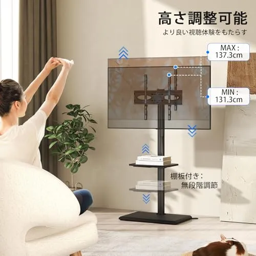 高さ調節、左右首振り:テレビ スタンドはブランケットが121.3から137.3 cmまで調整できます。左右角度35変えられ、首振りが出来ます。リビングルームでもキッチンでも各部屋からテレビを快適に楽しめます。