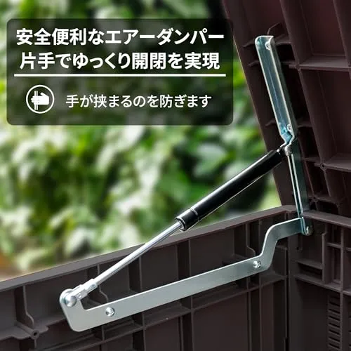 「豊富な機能・使い便利」:蓋の開閉はエアーダンパーの構造を採用しています。片手で軽い力で蓋を開閉でき、使い便利!また、開けったり閉めたり速度が緩やかになって、手が挟まれるのを防ぐことができます。両サイドに取っ手がついているので、箱を運ぶときに便利です。蓋に南京錠取付可能な構造がついており、別売りの南京錠を取り付けていただくことで盗難対策が可能です。