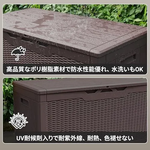 「ポリ樹脂素材・耐久性や防水性に優れ」:収納庫本体は厚手のポリ樹脂素材を採用し、耐久性、防水性、耐熱性に優れています。木製や金属製のストッカーと違い、朽ちるや錆びの心配がありません。優れた防水性で雨の侵入を防止し、収納物が濡れるのを防ぎます。UV耐候剤入りで紫外線で劣化しにくく、長い時間使っても色あせません。お手入れも便利で、汚れた場合は水洗いでOKです!