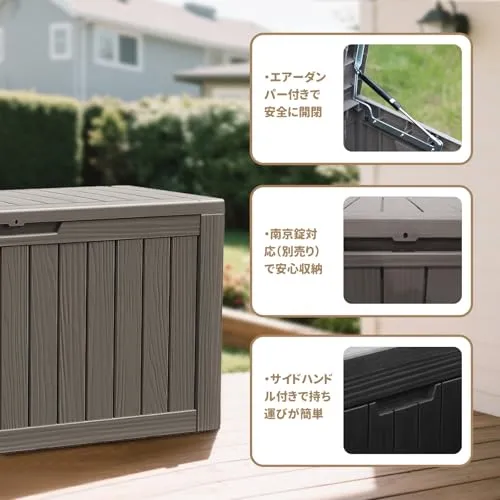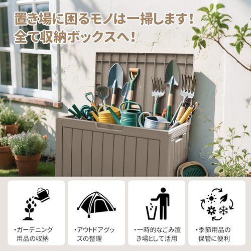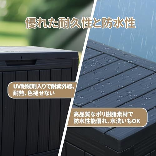 「おしゃれな木目デザイン&組み立て簡単」 収納庫表面の木目調デザインが全体に使われており、シンプルで贅沢な雰囲気を醸す出しています。収納用途だでけなく、飾りとしても使え、 庭、プール、ベランダ、ガーデンなどに適しています。様々な場所で大活躍!ガーデンやアウトドアの空間に自然に溶け込み、全体の美感を高めます。組み立てが簡単な仕様となっており、女性お一人でも簡単に組み立てられ、多くの方が10~15分ほどで仕上げられます。
