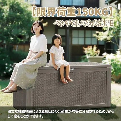 「多機能・便利なコンテナ」 安心の耐荷重ある。最大耐荷重は150kgで、大人2人で座っても全く問題ありません!サイドハンドル付きで持ちやすいです。そして、踏み台にしたり、座ってベンチ、テーブル、屋外宅配ボックスのように使用したりと、収納ストッカーでありながらいろいろな機能で便利なアイテムです。また、蓋に南京錠取付可能な構造がついており、防犯対策もバッチリ。(錠が別売り;170Lモデルはエアータンパーに搭載されてなく)