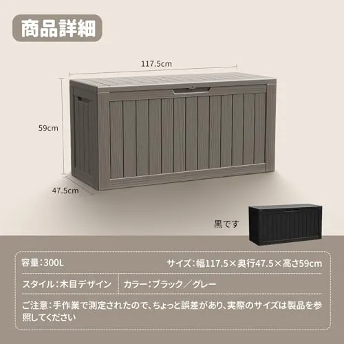 【収納庫使用上のご注意】 ※使用上のご注意:製品は組立式のボックスには小さな隙間がありますので、防雨型ですが完全防水ではありません。大雨や強風時には少量の水が浸入する可能性があります。貴重品を保管しないでください。底部からの水の浸入を防ぐため、水が溜まりやすい低地に収納ボックスを置かない