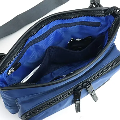 本体素材にはトラベルシーンを想定し、高密度ナイロンツイルに 裏加工を施して防水性を高めた機能的な生地を使用。ガンメタリック色の革を使用したポイント表現や特徴的なファスナー&引き手、シリコンワッペンによるロゴ表現、高密度ナイロンテープを使用しブランドらしさを表現。マチが広く大容量な前ポケット付きのカジュアルバッグです。