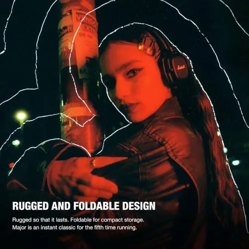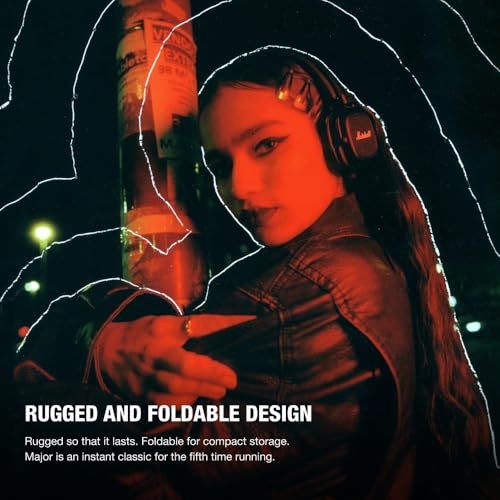 頑丈で耐久性のあるデザイン:頑丈で耐久性の高い折りたたみ可能なデザインは、簡単に収納してどこにでも持ち運ぶことができます。MajorシリーズはMarshall初のヘッドホンであり、モデルチェンジのたびに改良が続けられ、そのデザインは時代を超越し続けています。
